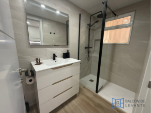 Baño de Lujo: Baño moderno con plato de ducha a ras de suelo, mampara de cristal con perfilería negra, grifería empotrada y un elegante mueble lavabo flotante. Cuenta con un gran espejo con iluminación integrada.
