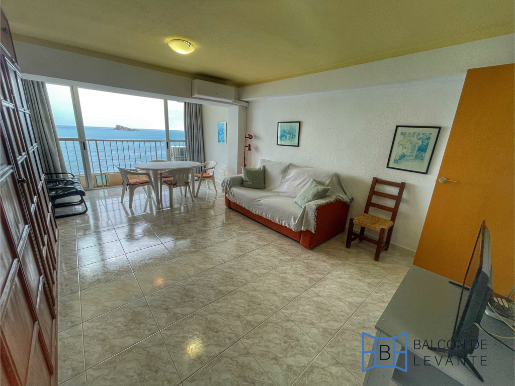 Lo primero que te atrapará al entrar es su amplio salón-comedor. Gracias a su gran ventanal de suelo a techo, la estancia se inunda de luz natural y fusiona el interior con el paisaje marítimo. Imagina desayunar cada mañana con la silueta de la Isla de Benidorm como único horizonte.