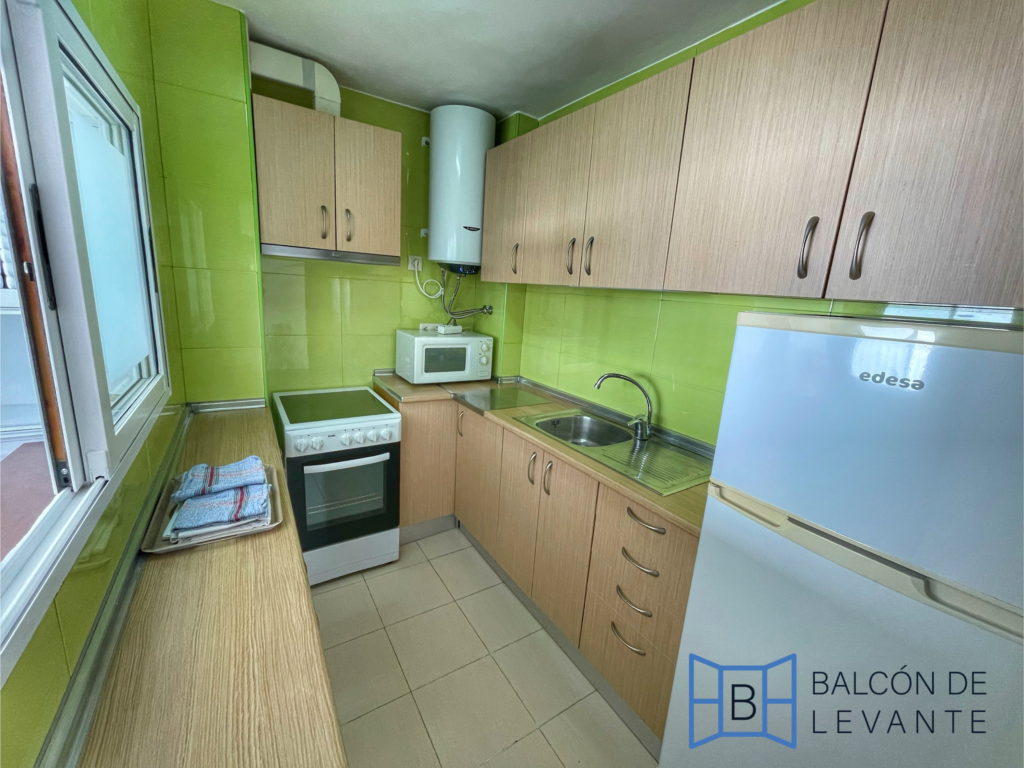 - Cocina Independiente: Totalmente equipada con electrodomésticos (horno, vitrocerámica, microondas y frigorífico), optimizada con mobiliario funcional en tonos madera y blanco.